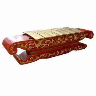Saron panerus, the middle pitch member; They are metallophones with six or seven bronze keys placed on a wooden frame. The player sits on the floor with the saron in front of them. The saron family consists of the smallest member;